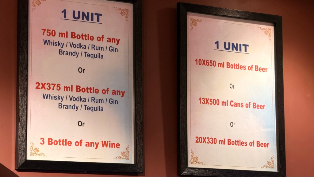 Abends Besuch im Wine Shop, Gujarat ist ein trockener Staat, nur Touristen und ansässige Ausländer dürfen mit einer Lizenz Alkohol in speziellen Geschäften kaufen, die Formalitäten sind ermüdend und der Alkohol ist rationiert in „Units“ (2 Units pro Person alle 10 Tage erscheint uns aber als ausreichend 😉), wir gehen fröhlich shoppen und verlassen den Shop als gefühlte „Most Wanted“, weil jeder entweder gierig oder entsetzt auf unsere Kartons starrt