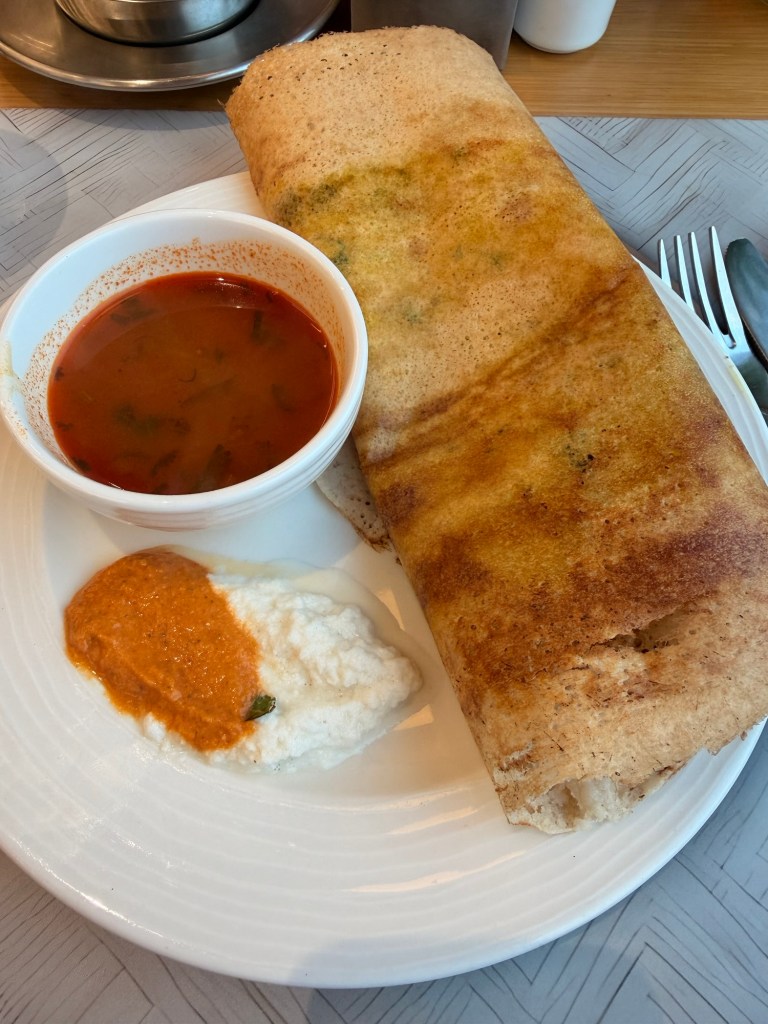 Frühstück im Hotel, Masala Dosa mit Kokos- und Tomatenchutney