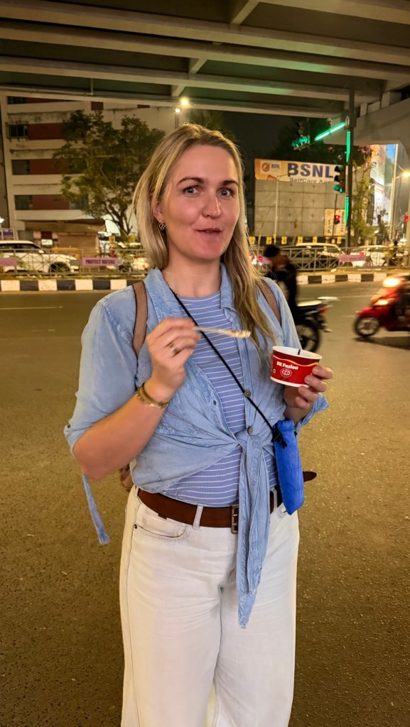 Anschließend holen wir uns noch ein kleines Abendessen bei Burger King. Das SB-Bestell-Terminal bringt Isi zum ersten Mal seit Ankunft in Indien an den Rande eines Nervenzusammenbruchs. Nach 20 Minuten Bestellvorgang (inkl. eigenhändiger Reparatur des Kartenlesegerätes) sitzen wir endlich mit unserem Abholzettel am Tisch und warten gespannt auf unsere Bestellung (statt Rind gibt es hier Hammel-Burger, wir gehen lieber auf Nummer Sicher und bestellen Chicken-Burger)