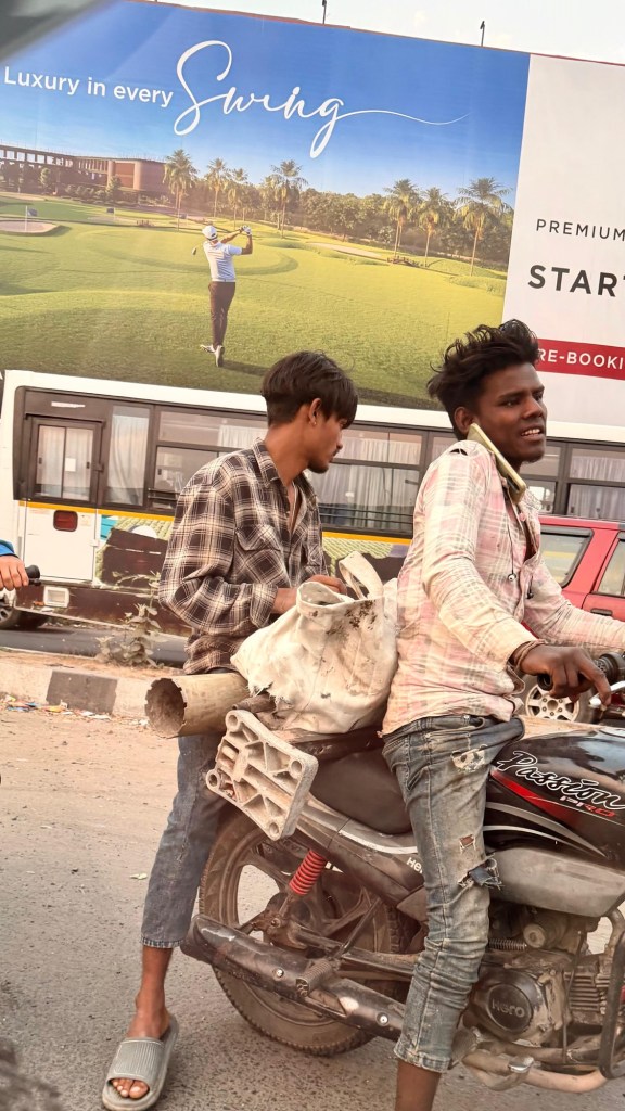 Die Kontraste Indiens in einem Bild vereint: Arbeiter, die mit ihren abgenutzten Arbeitsgeräten (Diamantbohrkronen, leider nicht von Hilti) auf fragwürdige Weise auf dem Heimweg sind, vor einem Plakat, das Werbung für ein luxuriöses Golf-SPA macht.