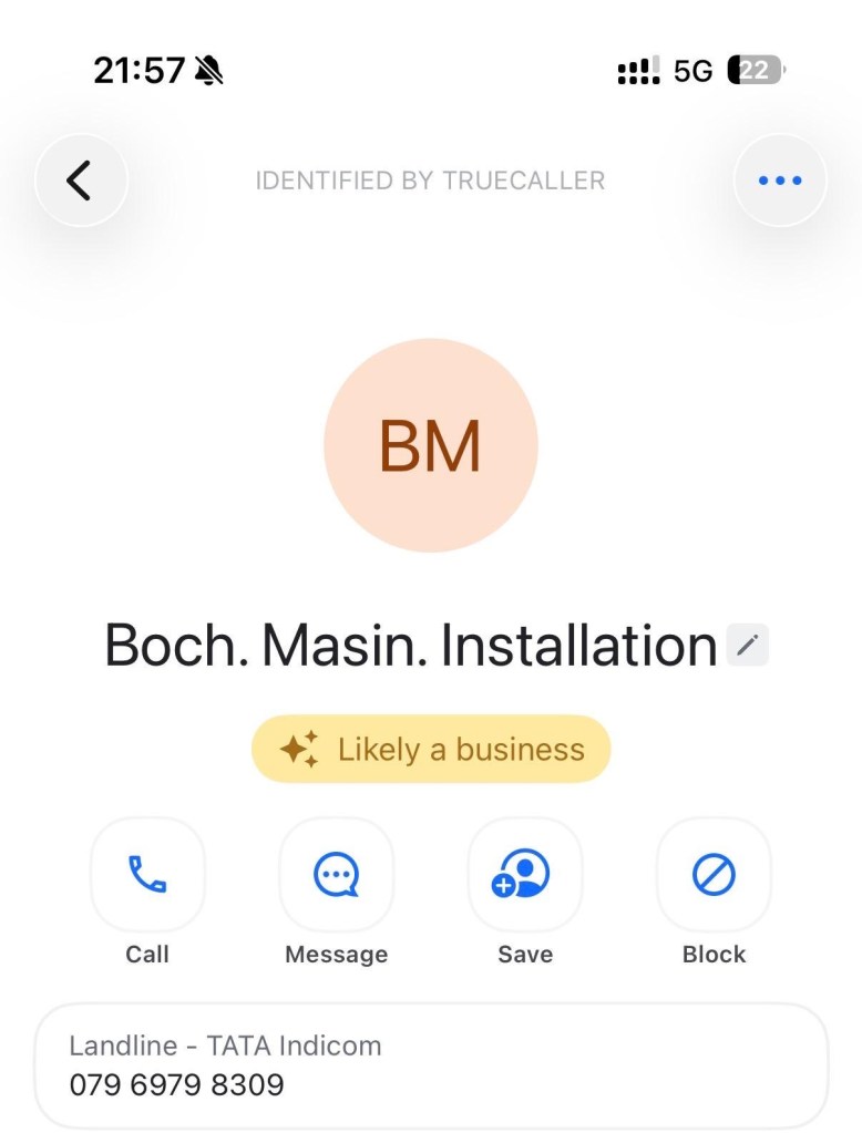 Da es in Indien an der Tagesordnung ist, zahlreiche Spam-Anrufe zu erhalten, gibt es Apps, die einem verraten, ob die anrufende Nummer vertrauenswürdig ist oder nicht. Cliff überprüft einen der zahlreichen Anrufer, der ihm Produkt-Demos für unsere Bosch-Waschmaschine anbietet, er scheint tatsächlich das zu sein, was er verspricht. Wir amüsieren uns über die offizielle Bezeichnung, da es in Indien keinen „sch“-Laut gibt. 🙂