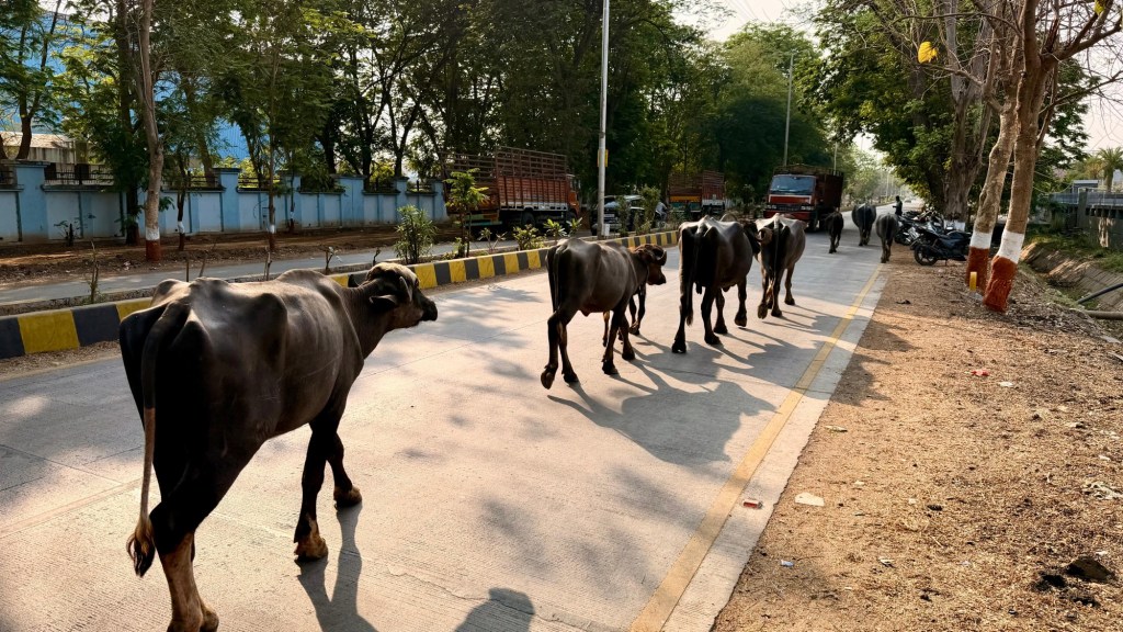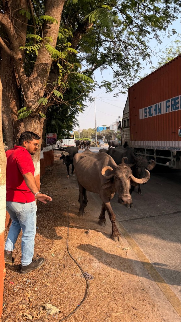 Die Straße vor unserem Werk ist eine beliebte Pilgerstrasse für Kühe, Autos und Kühe haben bekanntermaßen auf Indiens Straßen eine friedliche Koexistenz. Cliff korrigiert: Es sind Büffel. 😉