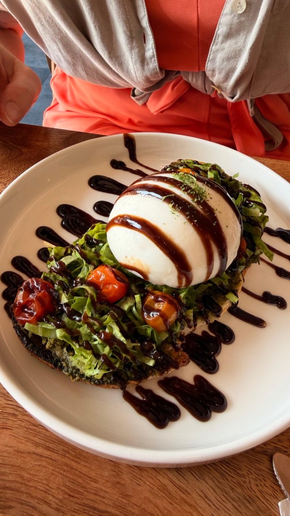 Wir bleiben auch zum Frühstück in der italienischen Küche und starten den Tag mit leckerem geröstetem Burrata-Brot und Wassermelonen-Feta-Salat. Nur die vermeintliche Balsamico-Creme erinnert eher an BBQ-Sauce, aber das lassen wir durchgehen. 🙂
