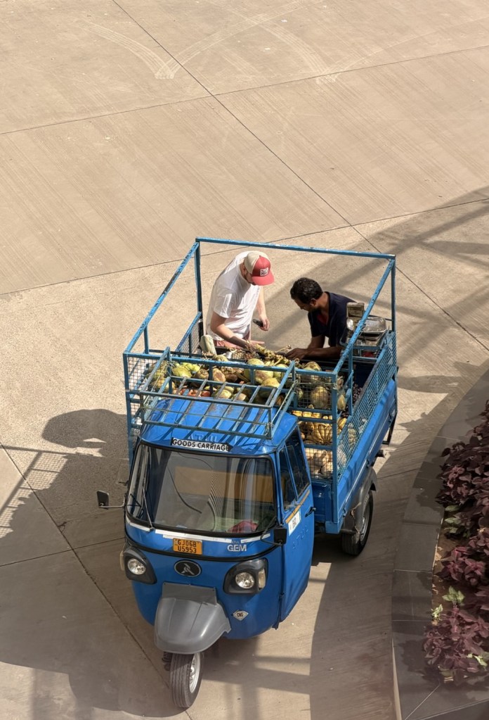 Heute geht die Putzaktion weiter, auf dem Plan stehen Balkon und Bäder. Beim Balkonputzen erspähen wir das Obst-TukTuk auf unserem Hof, Cliff begibt sich auf Shopping-Tour, Isi schaut vom Balkon aus zu.