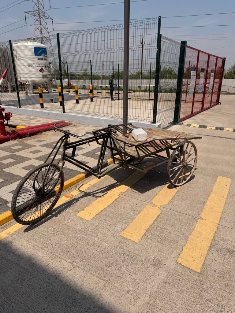 In der Mittagspause machen wir einen kleinen Spaziergang über das Werksgelände, dort findet Isi das Fahrrad wieder, das sie bereits vor 3 Jahren bei ihrem Besuch fotografiert hat, inzwischen fehlt neben den Pedalen auch die Polsterung des Sattels. Gut, dass die Räder Vollgummi sind, so kann man wenigstens nicht über platte Reifen klagen.