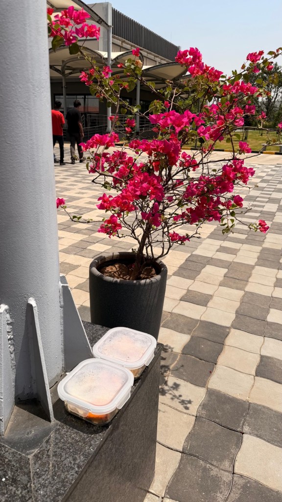Hin und wieder nehmen wir uns selbstgekochtes Essen vom Vorabend mit in die Firma. Da es keine Mikrowelle oder Ähnliches gibt, die Temperaturen aber allmählich die 40 Grad ankratzen, hat Cliff sich eine alternative Aufwärmmethode ausgedacht und stellt unser Essen immer 30 Minuten vor der Mittagspause in die Sonne.