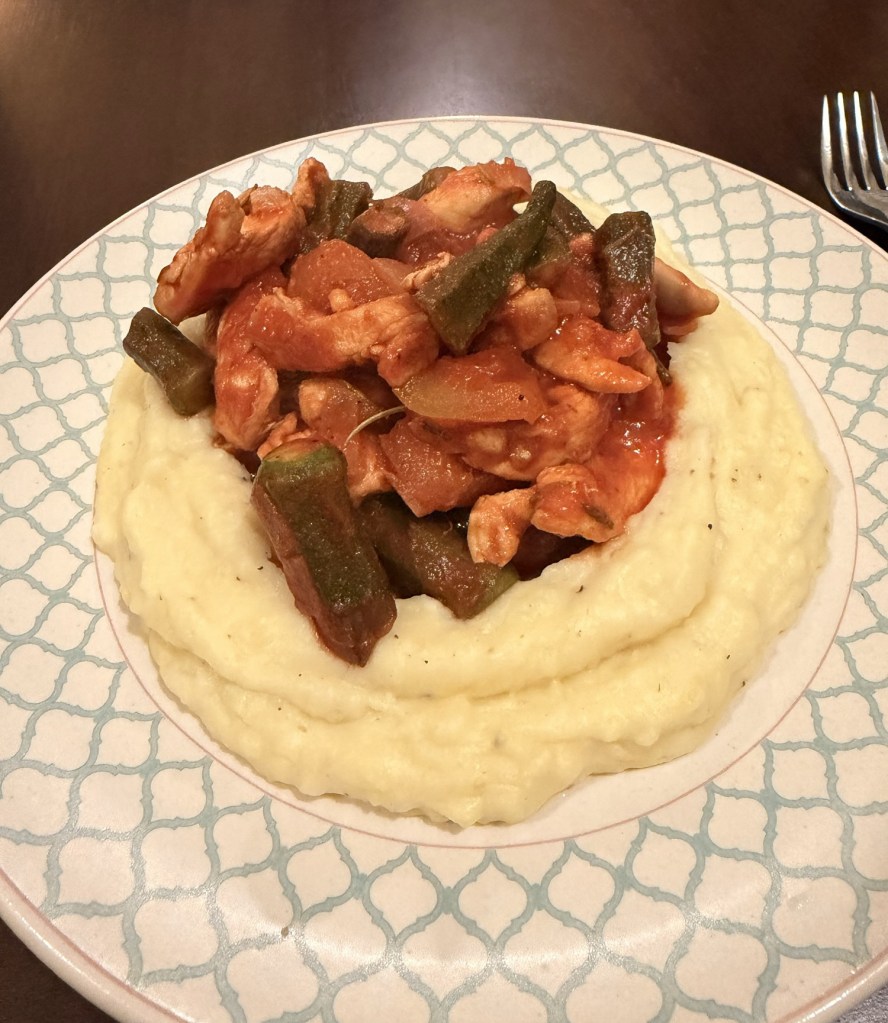 Unser Abendessen: Kartoffelpüree meets Ladyfingers, ein in Indien sehr beliebtes Gemüse.