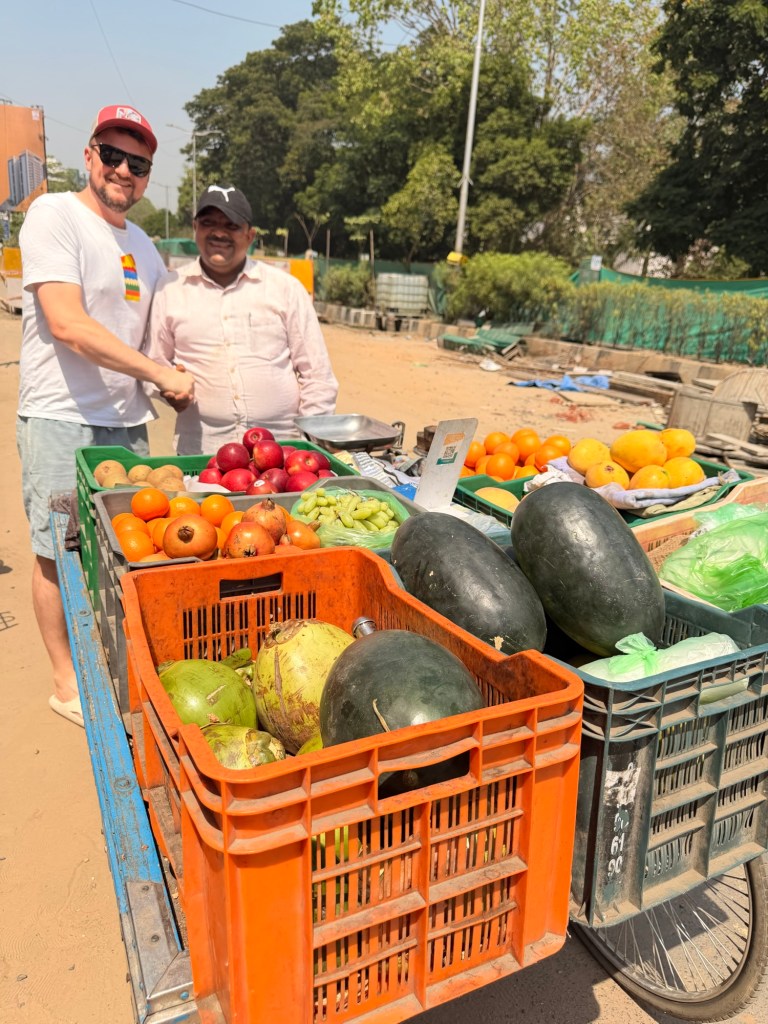 Nach dem Frühstück brechen wir auf um einen Adapter für unseren Gartenschlauch zu kaufen. Nach dem zweiten Anlauf sind wir erfolgreich und bekommen das passende Adapterstück für den Wasserhahn. Vor dem Laden treffen wir auf einen fliegenden Obsthändler und decken uns mit unserer wöchentlichen Obst-Ration ein.